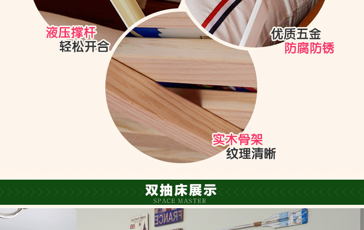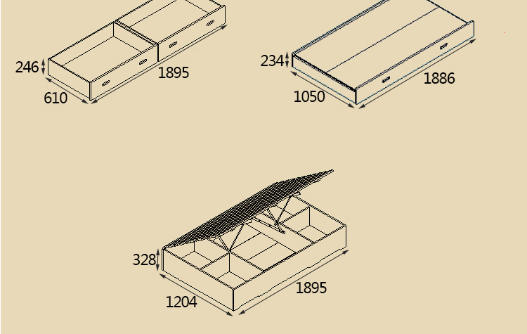 外围尺寸:K2208双层床1.2m2050*1310*1890mm; K2208双层床1.5m2050*1610*1890mm; F2-12气动床箱1895*1204*328mm; DG202拖斗1895*610*246mm; DG203拖床1886*1050*234mm。