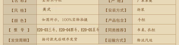 外围尺寸:E20-03三斗柜675*400*733mm; E20-04四斗柜675*400*935mm; E20-05五斗柜675*400*1137mm。