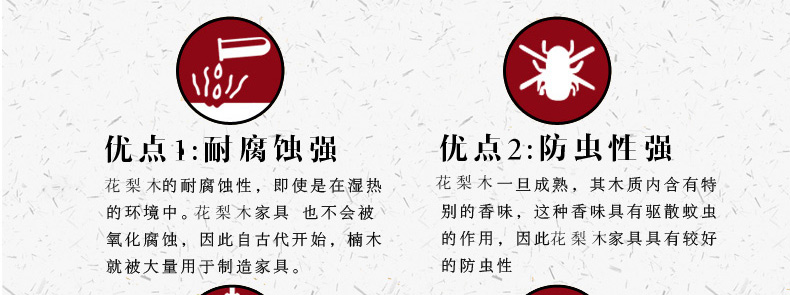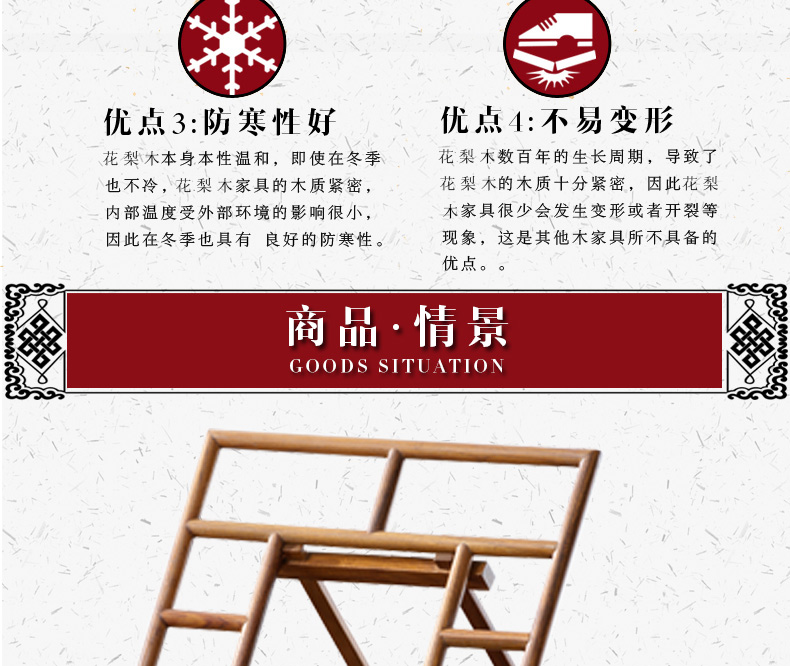 传统榫卯结构,预防开裂,结实耐用!采用花梨木手工制作,木质淳厚,放在家中,赏心悦目,格外雅致。设计新颖,个性美观。传统榫卯结构,牢固结实,不变形。品质保证。免漆做工精致,用料特别挑选,不上油漆,完全靠手工打磨,擦蜡,因为不上油漆,所以彻底杜绝了油漆的有害性,绝对健康环保。