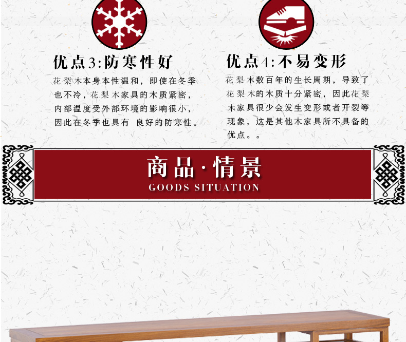 传统榫卯结构,预防开裂,结实耐用!采用花梨木手工制作,木质淳厚,放在家中,赏心悦目,格外雅致。设计新颖,个性美观。传统榫卯结构,牢固结实,不变形。品质保证。免漆做工精致,用料特别挑选,不上油漆,完全靠手工打磨,擦蜡,因为不上油漆,所以彻底杜绝了油漆的有害性,绝对健康环保。