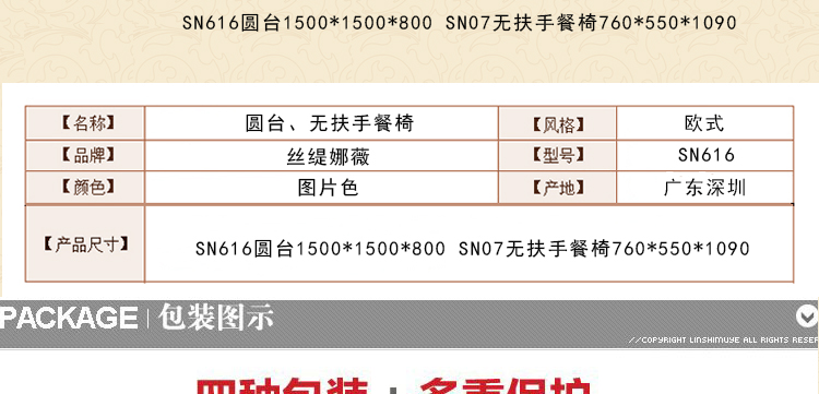 外围尺寸(长*宽*高):SN616圆台1500*1500*800 SN07无扶手餐椅760*550*1090mm