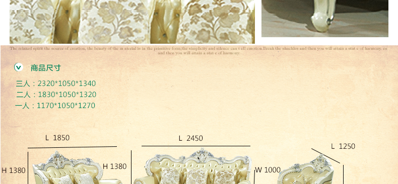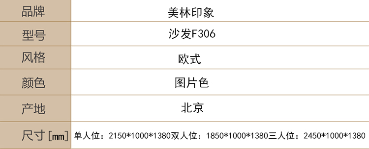 沙发尺寸(mm) 单人位长1250*宽1000*高1380, 双人位长1850*宽1000*高1380, 三人位长2450*宽1000*高1380,