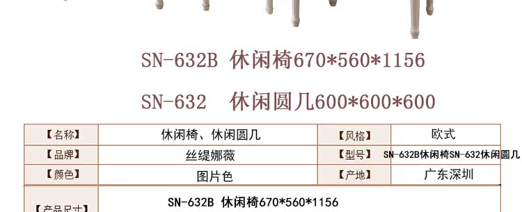外围尺寸(长*宽*高):SN-632B休闲椅670*560*1156 SN-632休闲圆几600*600*600