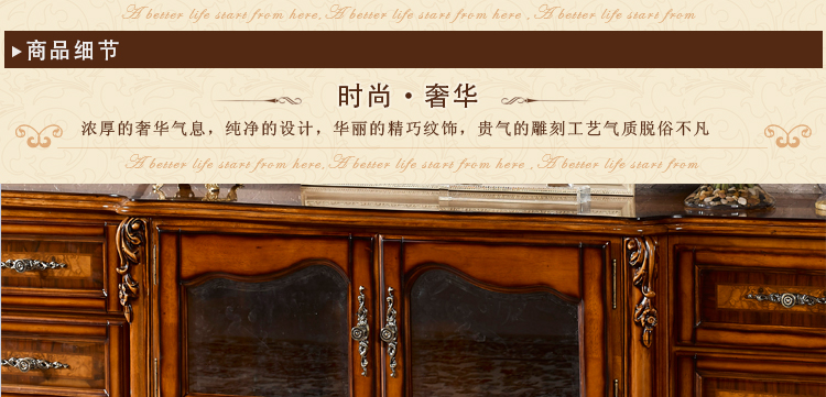 柔和的色调,大气典雅的外形,精巧的装饰点缀着每一个细节,隐隐浮现含蓄与稳重,撩拔着一种新的生活姿态,追求一种繁复夸饰,富丽堂皇,气势宏大,富于动感的艺术境界。高贵的生活品质,雍容华贵的内在气息,张扬的造型征服心灵,延续欧式的浪漫与精致!
