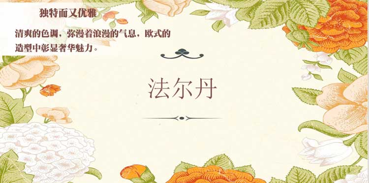 柔和的色调,大气典雅的外形,精巧的装饰点缀着每一个细节,隐隐浮现含蓄与稳重,撩拔着一种新的生活姿态,追求一种繁复夸饰,富丽堂皇,气势宏大,富于动感的艺术境界。高贵的生活品质,雍容华贵的内在气息,张扬的造型征服心灵,延续欧式的浪漫与精致!