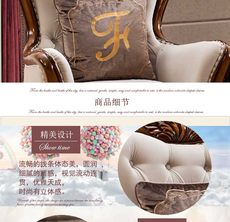 柔和的色调,大气典雅的外形,精巧的装饰点缀着每一个细节,隐隐浮现含蓄与稳重,撩拔着一种新的生活姿态,追求一种繁复夸饰,富丽堂皇,气势宏大,富于动感的艺术境界。高贵的生活品质,雍容华贵的内在气息,张扬的造型征服心灵,延续欧式的浪漫与精致!