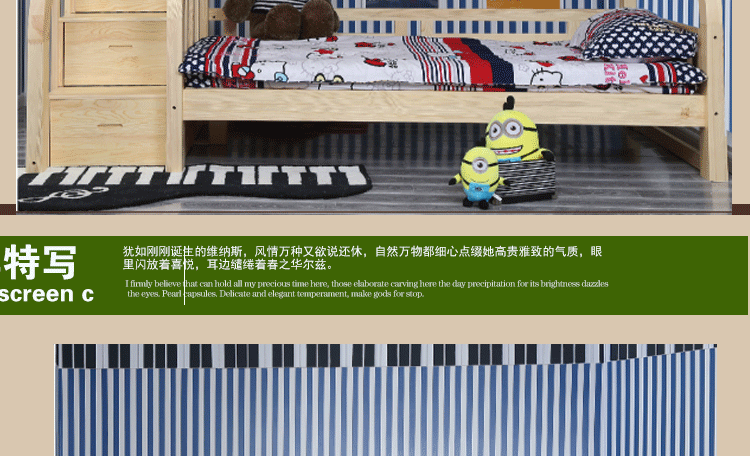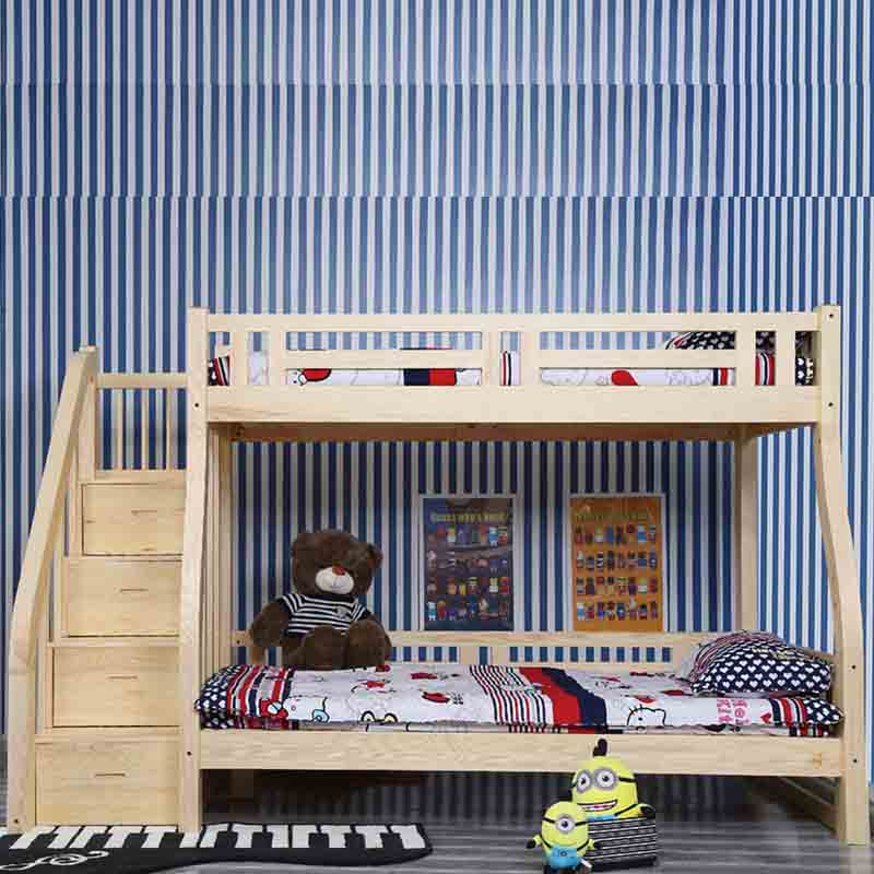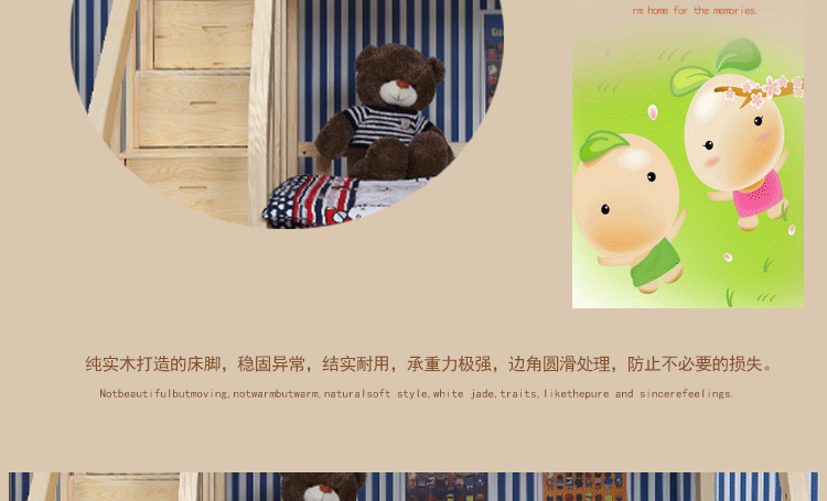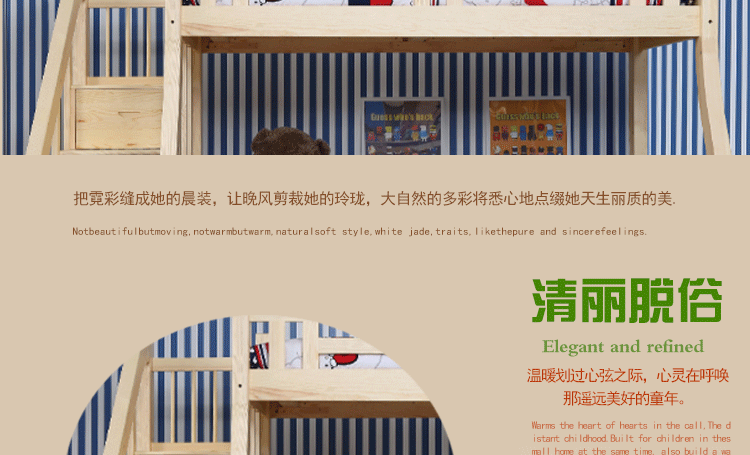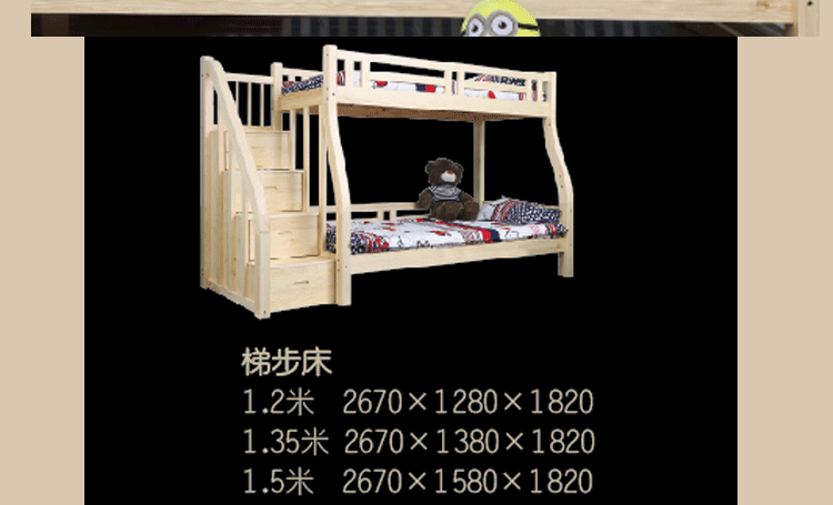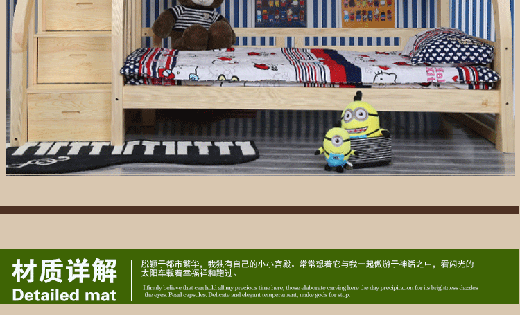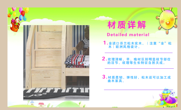 此款梯步床采用松木,环保无毒,而且浅色,很适合儿童房,浅色为主。