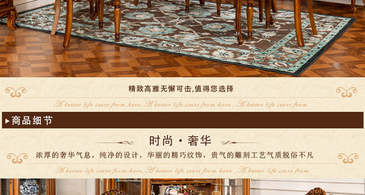 柔和的色调,大气典雅的外形,精巧的装饰点缀着每一个细节,隐隐浮现含蓄与稳重,撩拔着一种新的生活姿态,追求一种繁复夸饰,富丽堂皇,气势宏大,富于动感的艺术境界。高贵的生活品质,雍容华贵的内在气息,张扬的造型征服心灵,延续欧式的浪漫与精致!