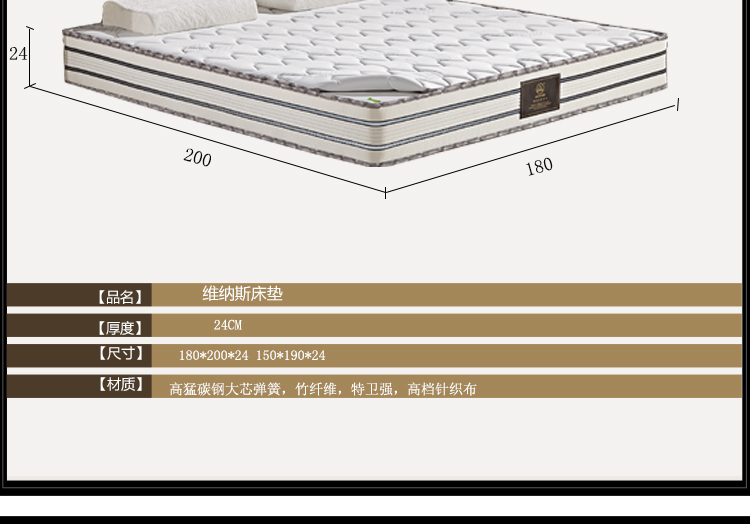 维纳斯床垫 舒适柔软双人床高猛碳钢大芯弹簧竹纤维 高档针织布 沃洛斯