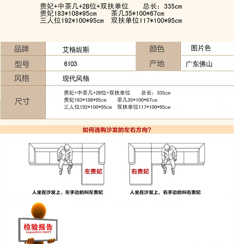 外围尺寸为贵妃+中茶几+2B位+双扶单位 总长:335cm 贵妃183*108*95cm 茶几35*100*67cm 三人位192*100*95cm 双扶单位117*100*95cm