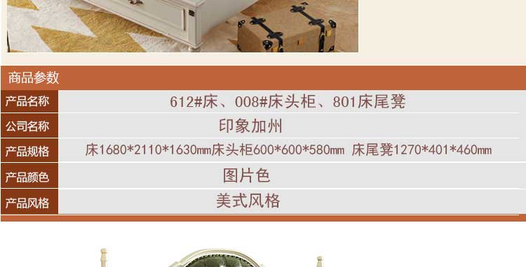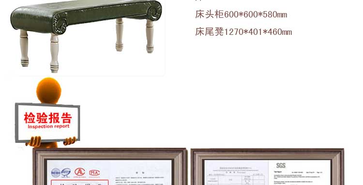 外围尺寸:床1680*2110*1630mm床头柜600*600*580mm 床尾凳1270*401*460mm