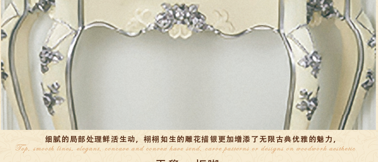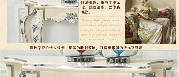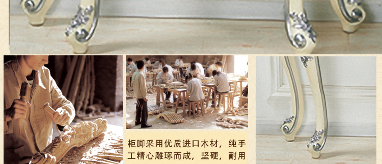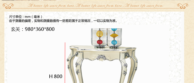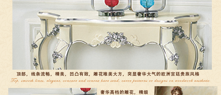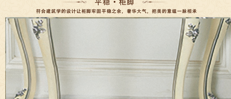 【品质优异】玄关台面平整光滑,精美承重脚,愣檐圆润饱满【用心设计】欧式简约的轮廓,细致的雕花点缀,描金工艺【价格实惠】