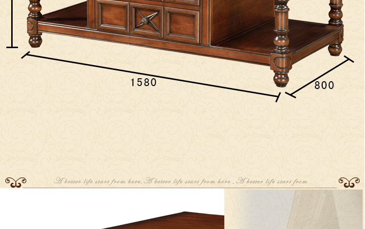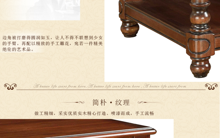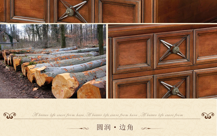 美式古老工艺技法,精雕细琢,完美极致。传达出美式风格的实木家具。木板采用的都是100%实木,防潮防腐防蛀超环保。木艺家具浑厚沉实、明朗高尚的独特韵味及风格。让您的家独具一格!