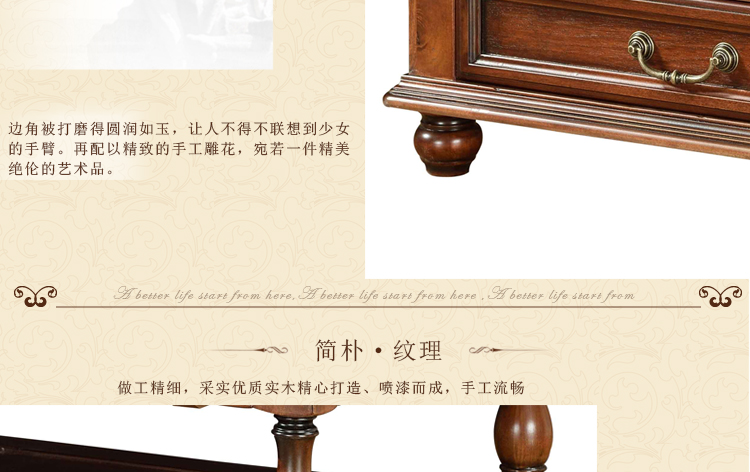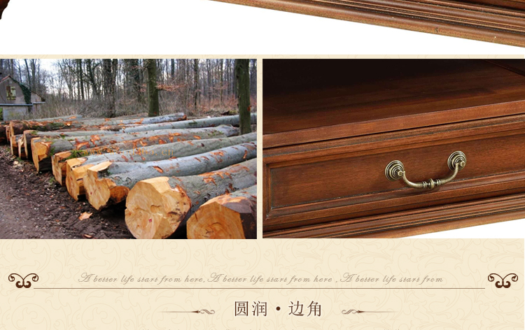 美式古老工艺技法,精雕细琢,完美极致。传达出美式风格的实木家具。木板采用的都是100%实木,防潮防腐防蛀超环保。木艺家具浑厚沉实、明朗高尚的独特韵味及风格。让您的家独具一格!