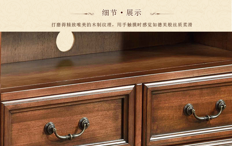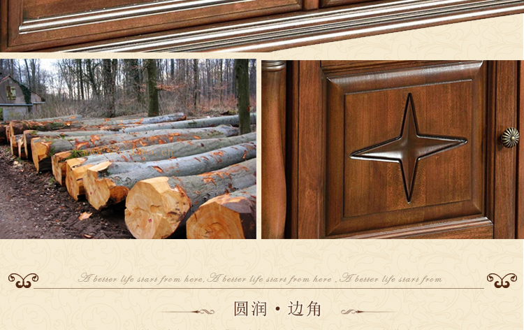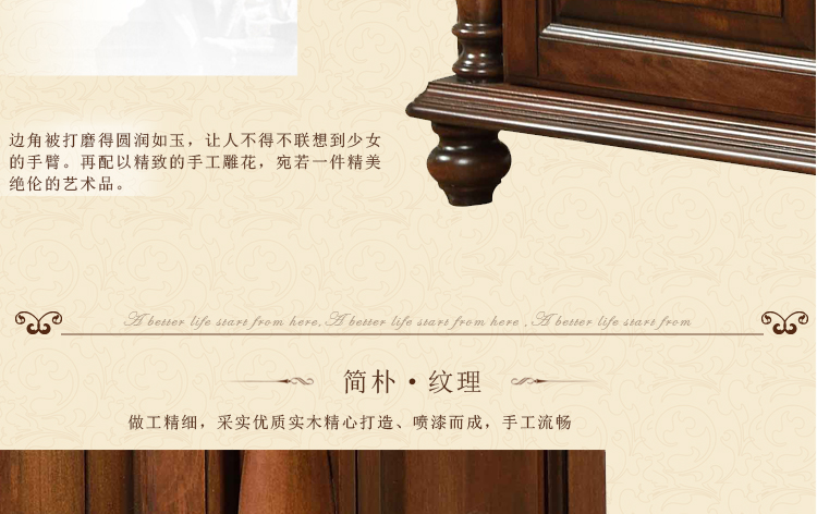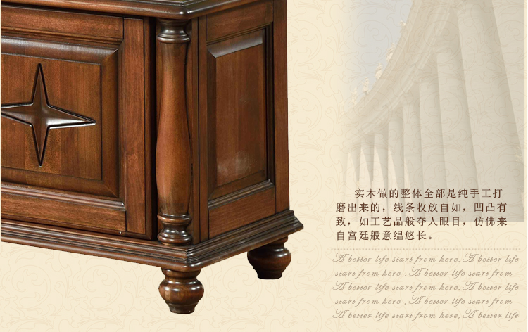 美式古老工艺技法,精雕细琢,完美极致。传达出美式风格的实木家具。木板采用的都是100%实木,防潮防腐防蛀超环保。木艺家具浑厚沉实、明朗高尚的独特韵味及风格。让您的家独具一格!