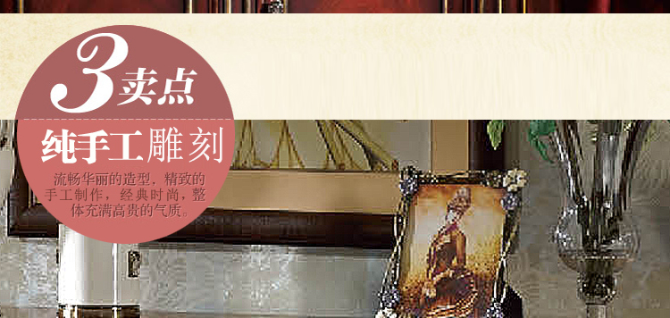 家具十分推崇优雅、高贵和浪漫,它是一种基于对理想情景的考虑,追求建筑的诗意、诗境,力求在气质上给人深度的感染。艺术风格最集中体现在家具的设计方面,要特征在于布局上突出轴线的对称,恢宏的气势,高贵典雅。细节处理上注重雕花、线条,制作工艺精细考究。