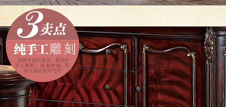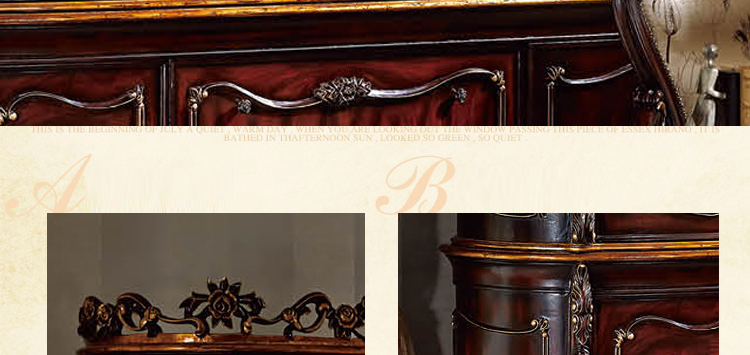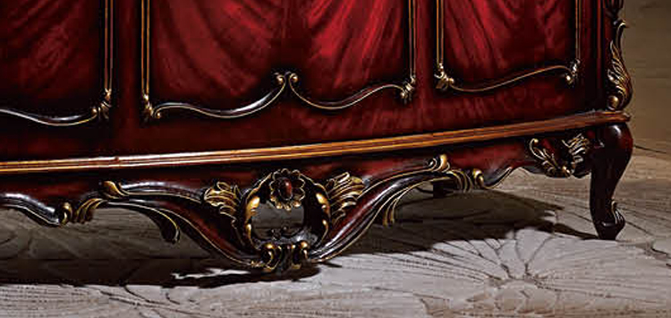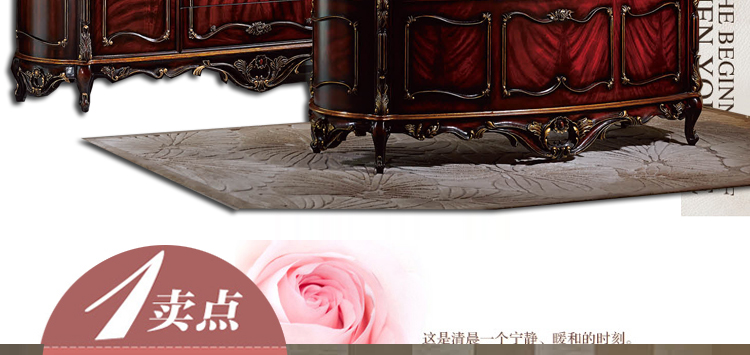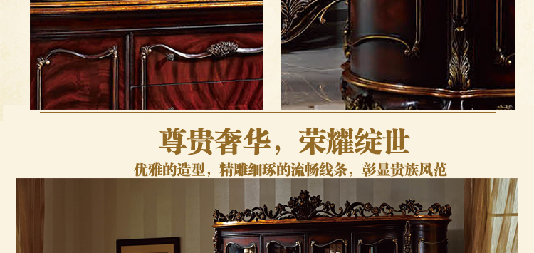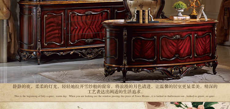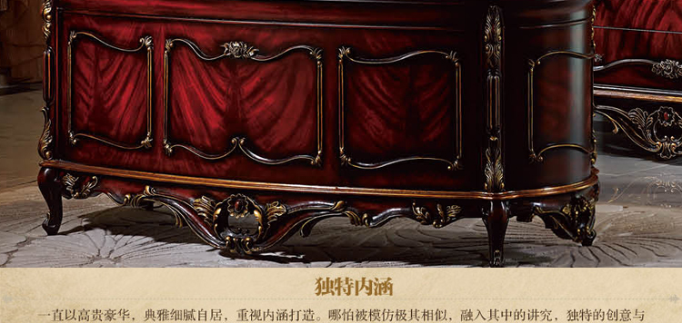 家具十分推崇优雅、高贵和浪漫,它是一种基于对理想情景的考虑,追求建筑的诗意、诗境,力求在气质上给人深度的感染。艺术风格最集中体现在家具的设计方面,要特征在于布局上突出轴线的对称,恢宏的气势,高贵典雅。细节处理上注重雕花、线条,制作工艺精细考究。