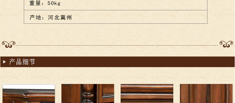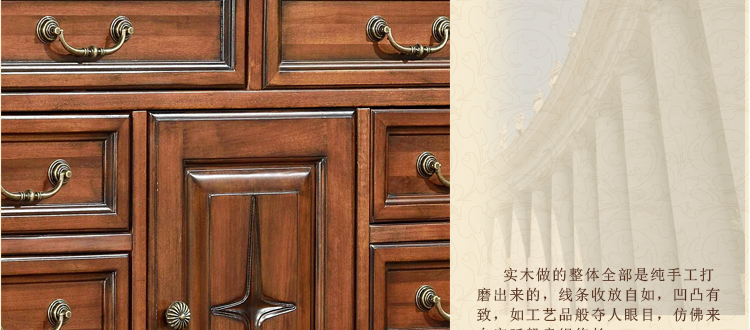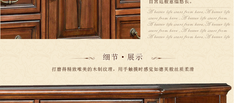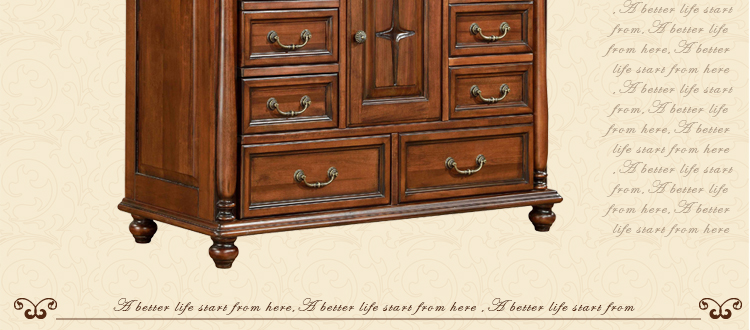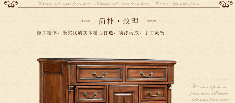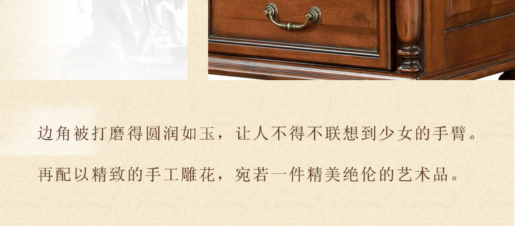 美式古老工艺技法,精雕细琢,完美极致。传达出美式风格的实木家具。木板采用的都是100%实木,防潮防腐防蛀超环保。木艺家具浑厚沉实、明朗高尚的独特韵味及风格。让您的家独具一格!