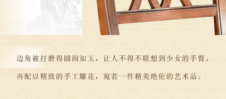 美式古老工艺技法,精雕细琢,完美极致。传达出美式风格的实木家具。木板采用的都是100%实木,防潮防腐防蛀超环保。木艺家具浑厚沉实、明朗高尚的独特韵味及风格。让您的家独具一格!