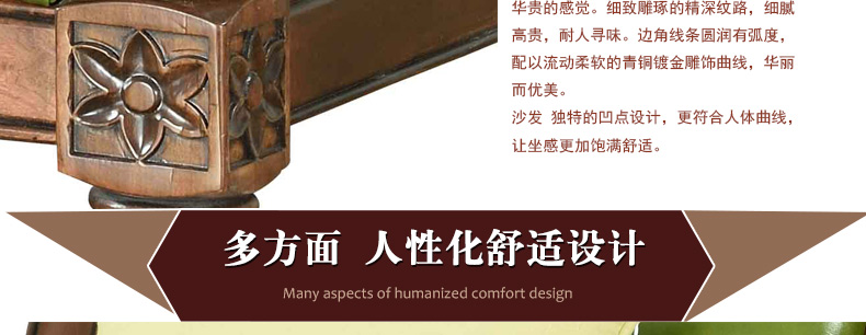 沙发收到了,实木雕花很漂亮精美 皮质也很好 坐垫软硬度适中,坐起来很舒适, 颜色很高雅 ,很高档 ,奢华范儿 ,有品位质量蛮不错的,包装的很仔细,摆放起来很显时尚高档。非常满意。