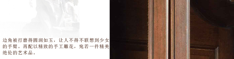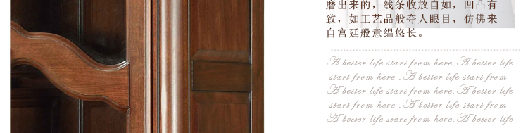 美式古老工艺技法,精雕细琢,完美极致。传达出美式风格的实木家具。木板采用的都是100%实木,防潮防腐防蛀超环保。木艺家具浑厚沉实、明朗高尚的独特韵味及风格。让您的家独具一格!
