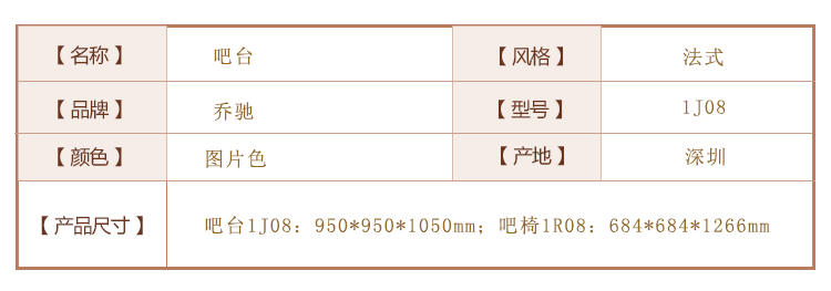 外围尺寸:吧台1J08:950*950*1050mm; 吧椅1R08:684*684*1266mm。