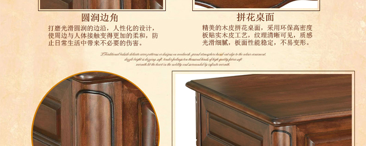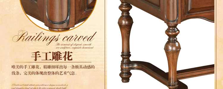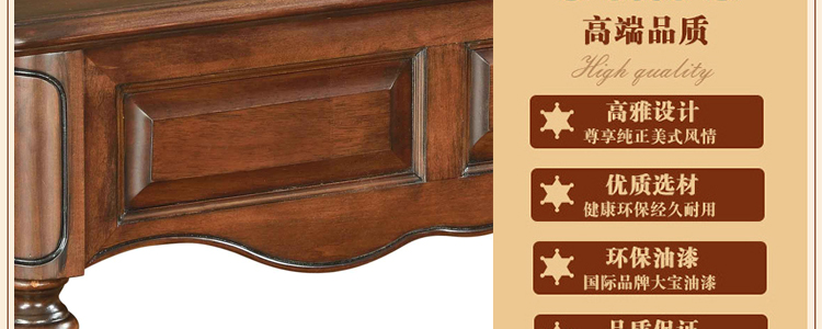 美式古老工艺技法,精雕细琢,完美极致。传达出美式风格的实木家具。木板采用的都是100%实木,防潮防腐防蛀超环保。木艺家具浑厚沉实、明朗高尚的独特韵味及风格。让您的家独具一格!