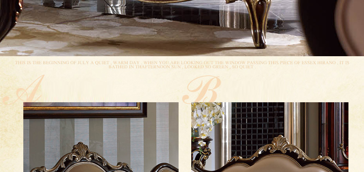 家具十分推崇优雅、高贵和浪漫,它是一种基于对理想情景的考虑,追求建筑的诗意、诗境,力求在气质上给人深度的感染。艺术风格最集中体现在家具的设计方面,要特征在于布局上突出轴线的对称,恢宏的气势,高贵典雅。细节处理上注重雕花、线条,制作工艺精细考究。