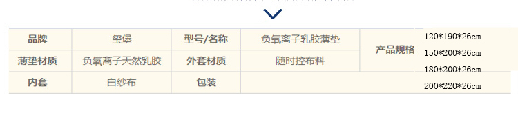 外围尺寸:120*190*26cm; 150*200*26cm; 180*200*26cm; 200*220*26cm; (上层:5cm裥棉外套(含2cm负离子记忆棉)+2cm乳胶+18CM无边框床网+特硬白护边框 +下层:2cm裥棉外套)