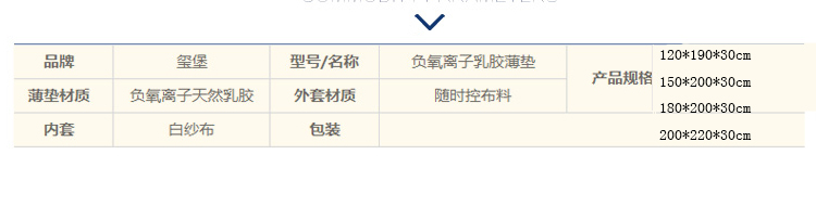 外围尺寸:120*190*30cm; 150*200*30cm; 180*200*30cm; 200*220*30cm。 (上层:5cm裥棉外套(2cm负氧离子记忆棉)+ 5CM迷你簧+18CM无边框独立弹簧 +特硬白护边框+下层:2cm裥棉外套)