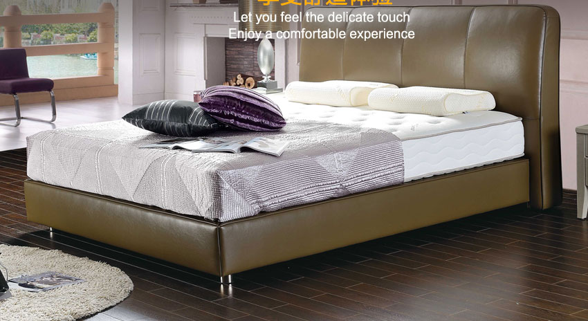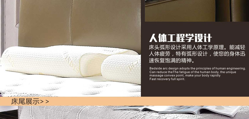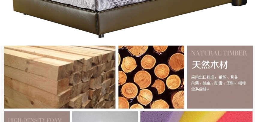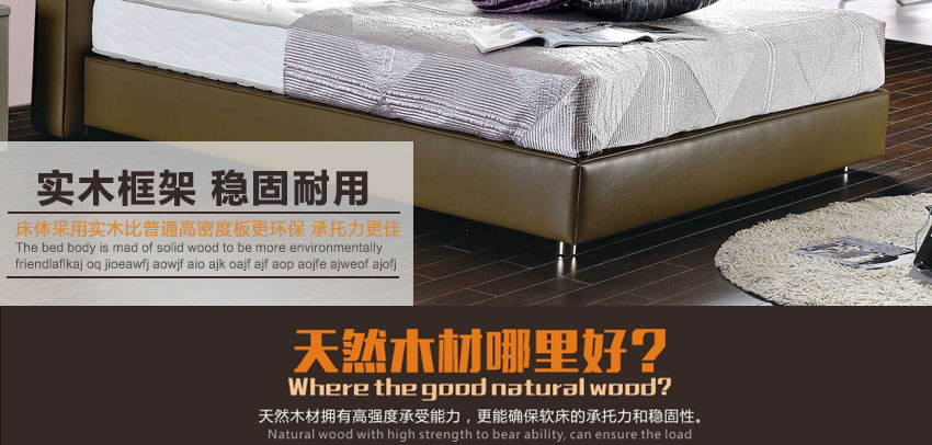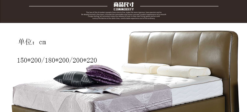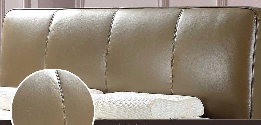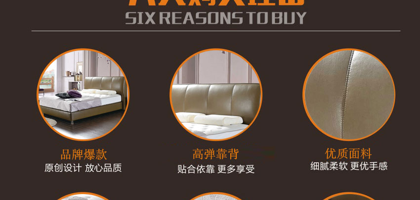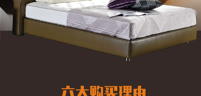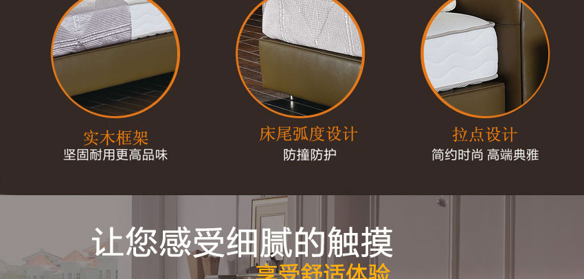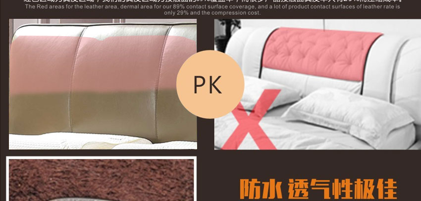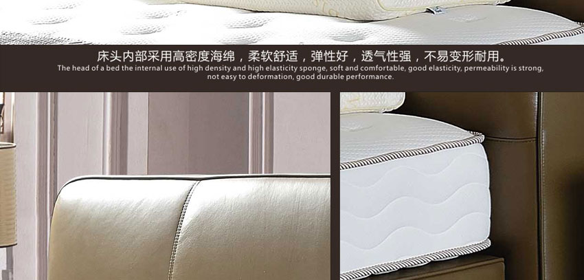 1.精选牛皮,实木框架结构,加固高受力排骨架承受力更强,高密度耐压海棉,非常饱满,使靠背更加舒适,专利设计,仅此一家。2.不含甲醛,环保健康,让买家享受更舒适的睡眠