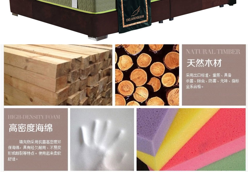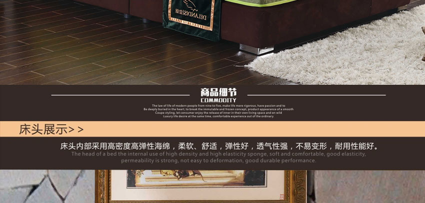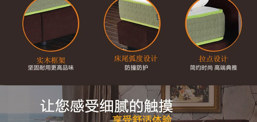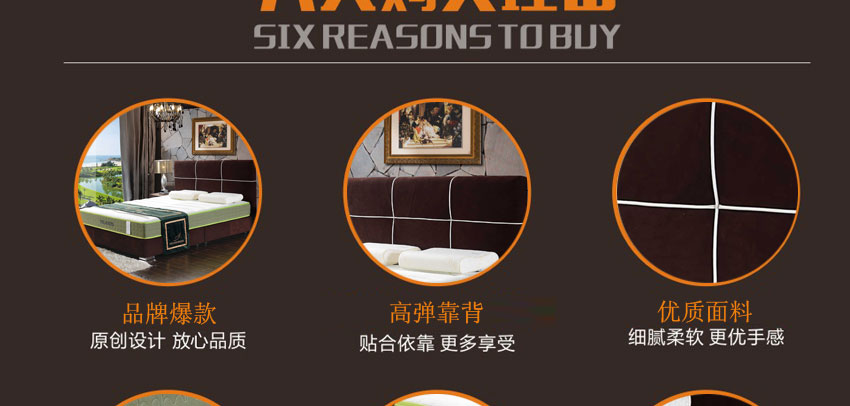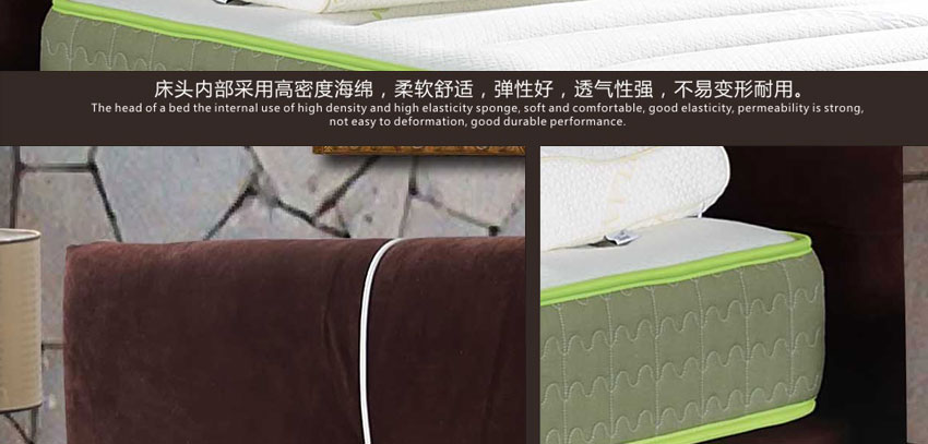 1.高级棉布,实木框架结构,加固高受力排骨架承受力更强,高密度耐压海棉,非常饱满,使靠背更加舒适,专利设计,仅此一家。2.不含甲醛,环保健康,让买家享受更舒适的睡眠