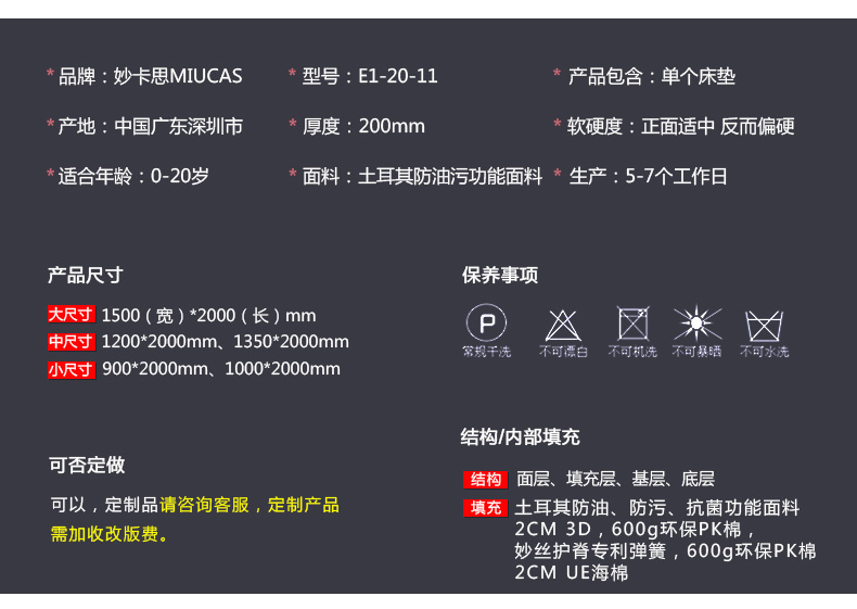 MIUCAS/妙卡思3D纯天然儿童床垫 特价弹簧席梦思可水洗透气高科技E1-20-11