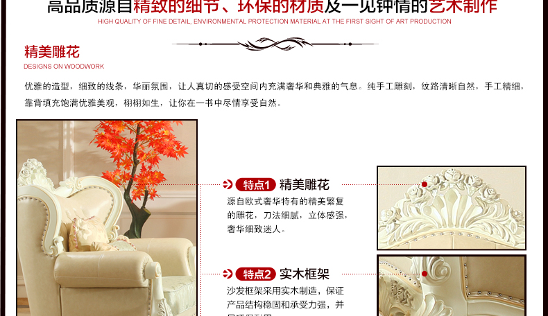 欧式风格家具特点讲究手工精细的裁切雕刻,轮廓和转折部分由对称而富有节奏感的曲线或曲面构成,结构简练,线条流畅,色彩富丽,艺术感强,给人的整体感觉是华贵优雅,十分庄重。