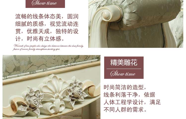 欧式风格家具特点讲究手工精细的裁切雕刻,轮廓和转折部分由对称而富有节奏感的曲线或曲面构成,结构简练,线条流畅,色彩富丽,艺术感强,给人的整体感觉是华贵优雅,十分庄重。