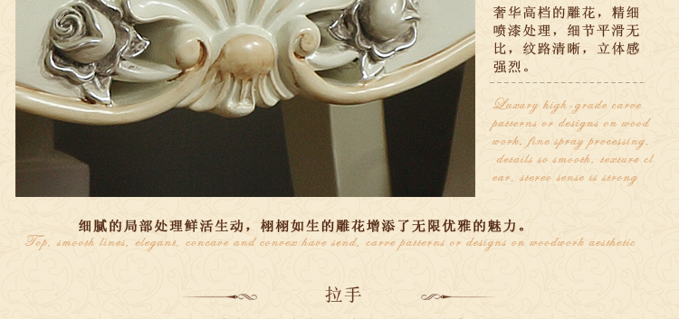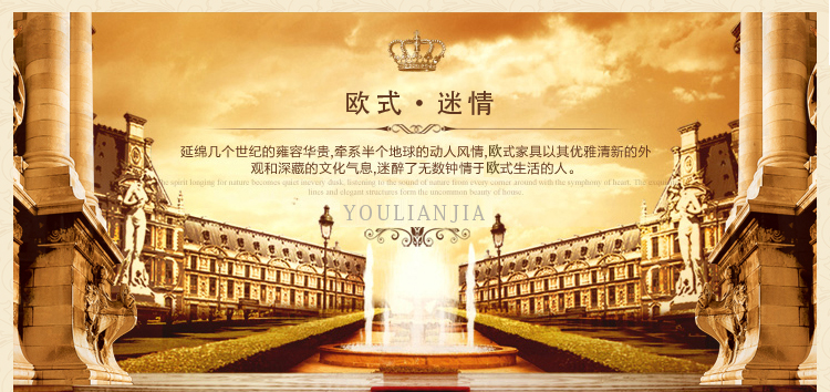 欧式风格家具特点讲究手工精细的裁切雕刻,轮廓和转折部分由对称而富有节奏感的曲线或曲面构成,结构简练,线条流畅,色彩富丽,艺术感强,给人的整体感觉是华贵优雅,十分庄重。