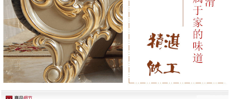 欧式风格家具特点讲究手工精细的裁切雕刻,轮廓和转折部分由对称而富有节奏感的曲线或曲面构成,结构简练,线条流畅,色彩富丽,艺术感强,给人的整体感觉是华贵优雅,十分庄重。