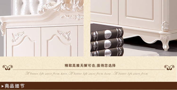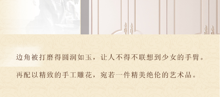 欧式风格家具特点讲究手工精细的裁切雕刻,轮廓和转折部分由对称而富有节奏感的曲线或曲面构成,结构简练,线条流畅,色彩富丽,艺术感强,给人的整体感觉是华贵优雅,十分庄重。