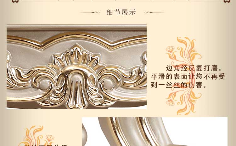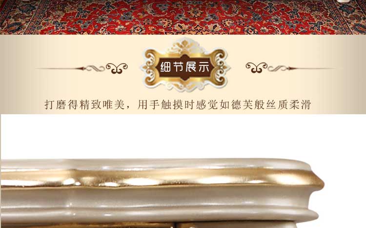 欧式风格家具特点讲究手工精细的裁切雕刻,轮廓和转折部分由对称而富有节奏感的曲线或曲面构成,结构简练,线条流畅,色彩富丽,艺术感强,给人的整体感觉是华贵优雅,十分庄重。