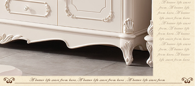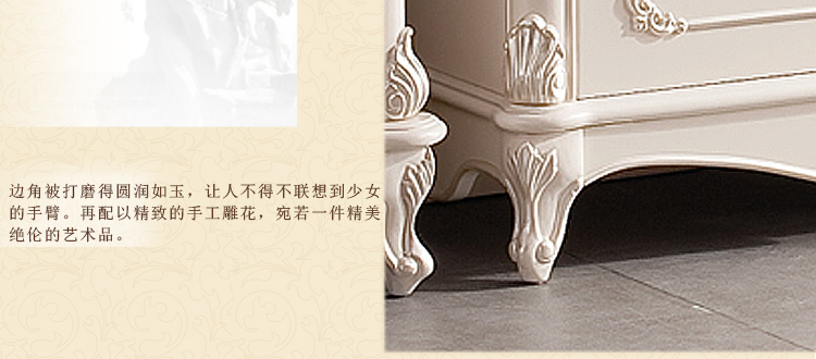 欧式风格家具特点讲究手工精细的裁切雕刻,轮廓和转折部分由对称而富有节奏感的曲线或曲面构成,结构简练,线条流畅,色彩富丽,艺术感强,给人的整体感觉是华贵优雅,十分庄重。