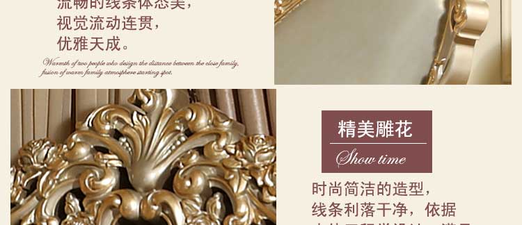 欧式风格家具特点讲究手工精细的裁切雕刻,轮廓和转折部分由对称而富有节奏感的曲线或曲面构成,结构简练,线条流畅,色彩富丽,艺术感强,给人的整体感觉是华贵优雅,十分庄重。