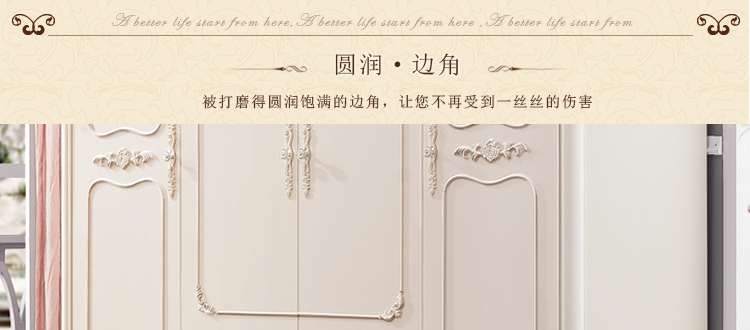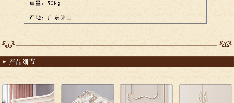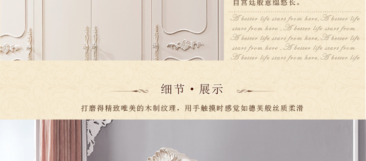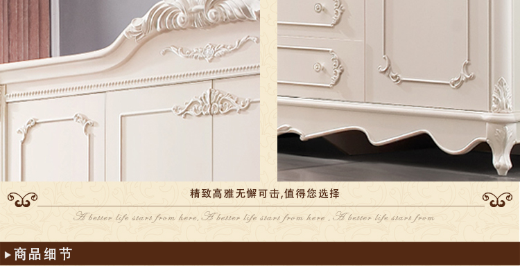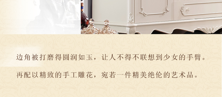 欧式风格家具特点讲究手工精细的裁切雕刻,轮廓和转折部分由对称而富有节奏感的曲线或曲面构成,结构简练,线条流畅,色彩富丽,艺术感强,给人的整体感觉是华贵优雅,十分庄重。