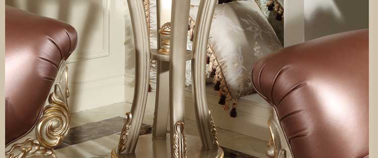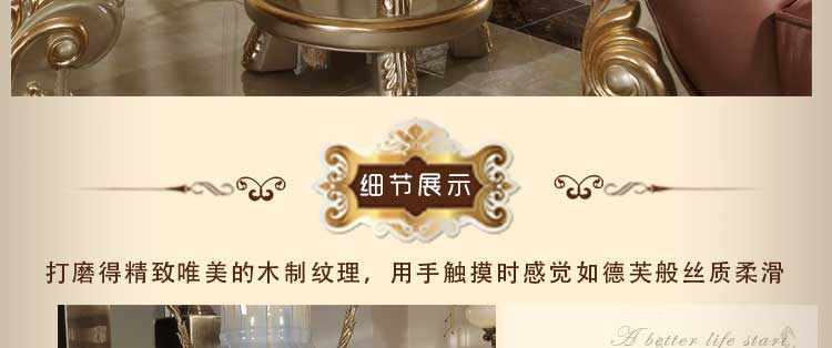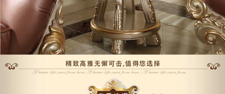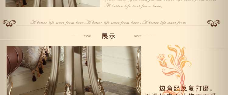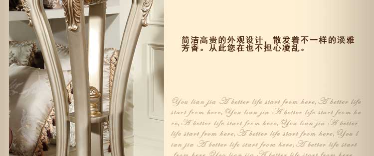 欧式风格家具特点讲究手工精细的裁切雕刻,轮廓和转折部分由对称而富有节奏感的曲线或曲面构成,结构简练,线条流畅,色彩富丽,艺术感强,给人的整体感觉是华贵优雅,十分庄重。