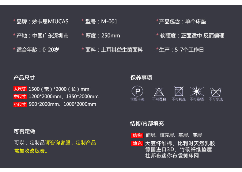 MIUCAS/妙卡思儿童弹簧席梦思 1.5米1.2米进口3D乳胶竹碳纤维床垫M-001