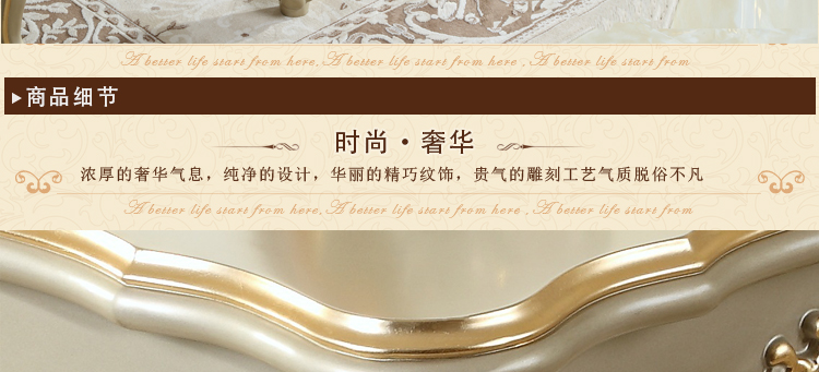 欧式风格家具特点讲究手工精细的裁切雕刻,轮廓和转折部分由对称而富有节奏感的曲线或曲面构成,结构简练,线条流畅,色彩富丽,艺术感强,给人的整体感觉是华贵优雅,十分庄重。