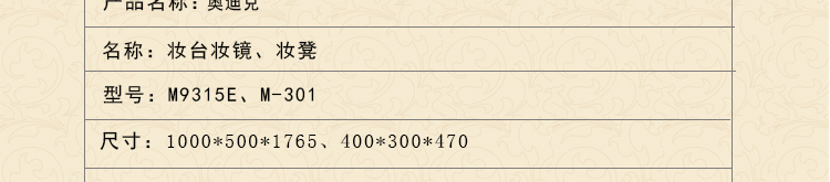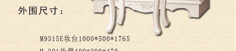 外围尺寸:M9315E妆台1000*500*1765; M-301通用妆凳400*300*470。