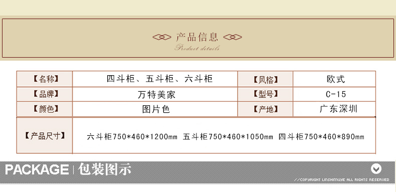 外围尺寸为六斗柜750*460*1200mm 五斗柜750*460*1050mm 四斗柜750*460*890mm
