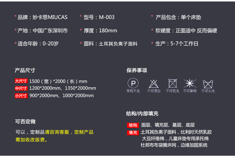 MIUCAS/妙卡思青少年儿童席梦思1.5米弹簧双人比利时进口乳胶床垫M-003