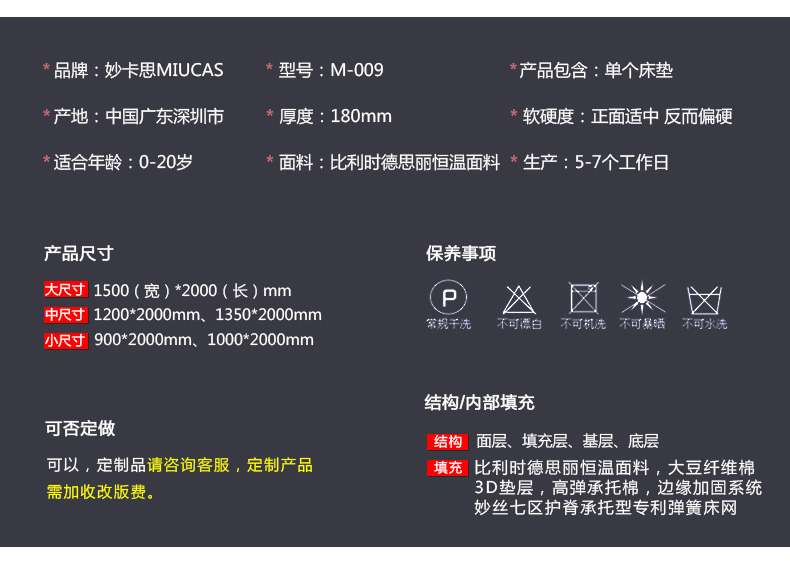 MIUCAS/妙卡思恒温面料纯天然儿童3D床垫 透气护脊高弹弹簧席梦思M-009