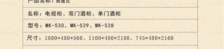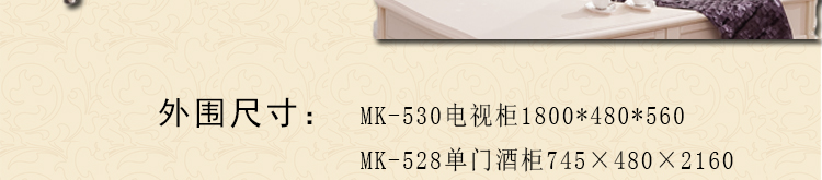 外围尺寸:MK-530电视柜1800*480*560; MK-528单门酒柜745*480*2160; MK-529双门酒柜1100*480*2180。